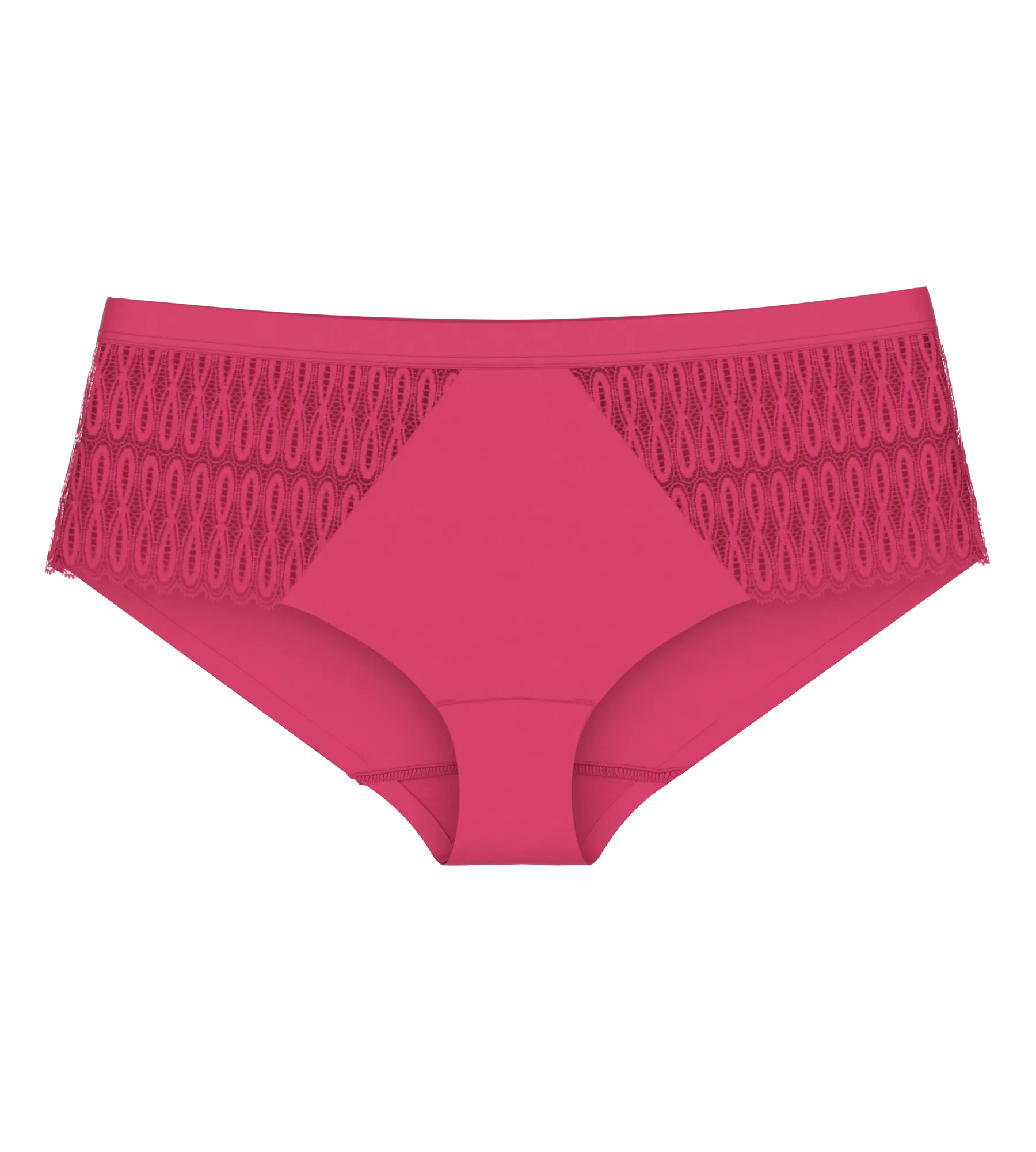Magas derekú bugyi, amely rásimul domborulataidra. A puha, bőrre simuló anyagot a részletgazdag szegélyek teszik teljessé.