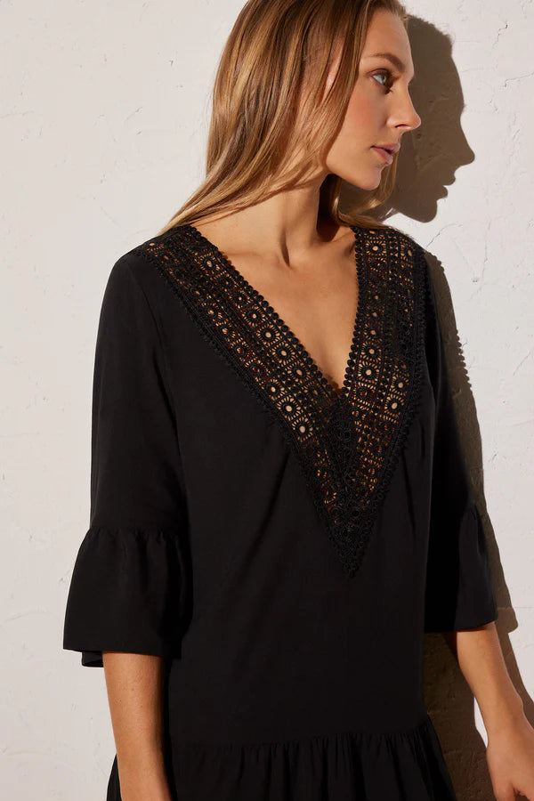 Ysabel Mora 85946 3/4 ujjú strandruha. "V" nyakkivágással, csipke díszítéssel. Könnyű és friss anyag, ideális a kollekció bikinihez vagy fürdőruhájához, vagy sétálni.